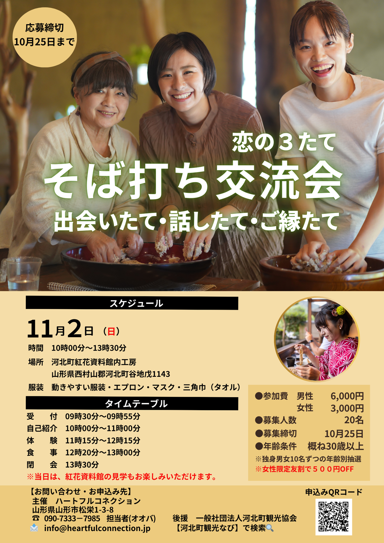 場所は、河北町の紅花資料館内を利用しそば打ち体験を行います。そば打ちの匠を先生に迎え、男女16名がそば打ち体験を通じて楽しんでもらう企画です。後援には、一般社団法人河北町観光協会さまが応援してくださります。どんどん焼や紅花の種茶の振る舞いもお楽しみください。また、見事カップリング成立した際には粗品の進呈もございます。食後に資料館の見学も予定しておりますので、ご満足いただけるイベントです。