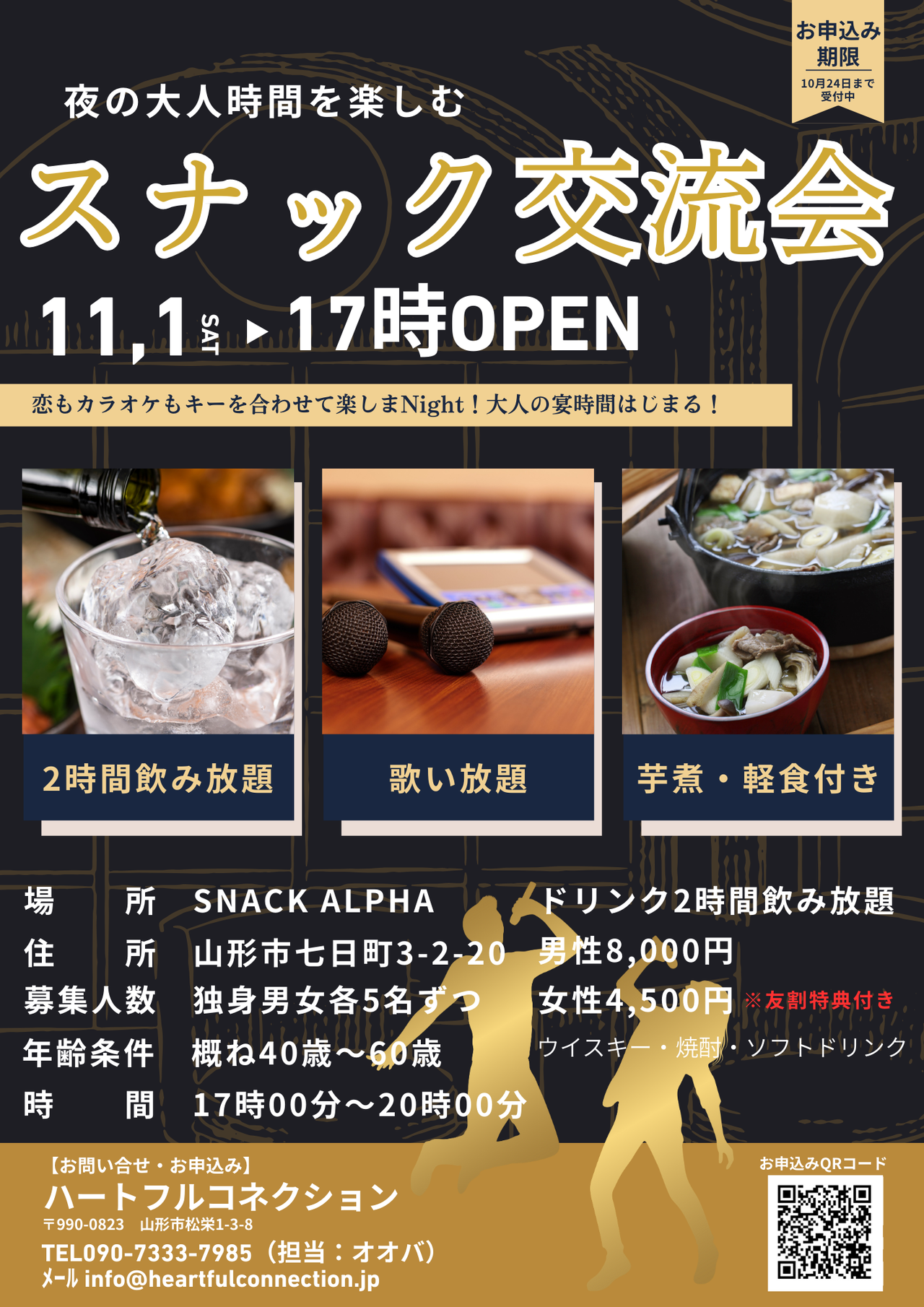 山形市の中心部にあるスナックを貸切り、お酒の力も借りて楽しむ交流会。お酒の飲み方も大事な確認点ですよね!アトラクション付の楽しい企画で大人時間を過ごしましょう!