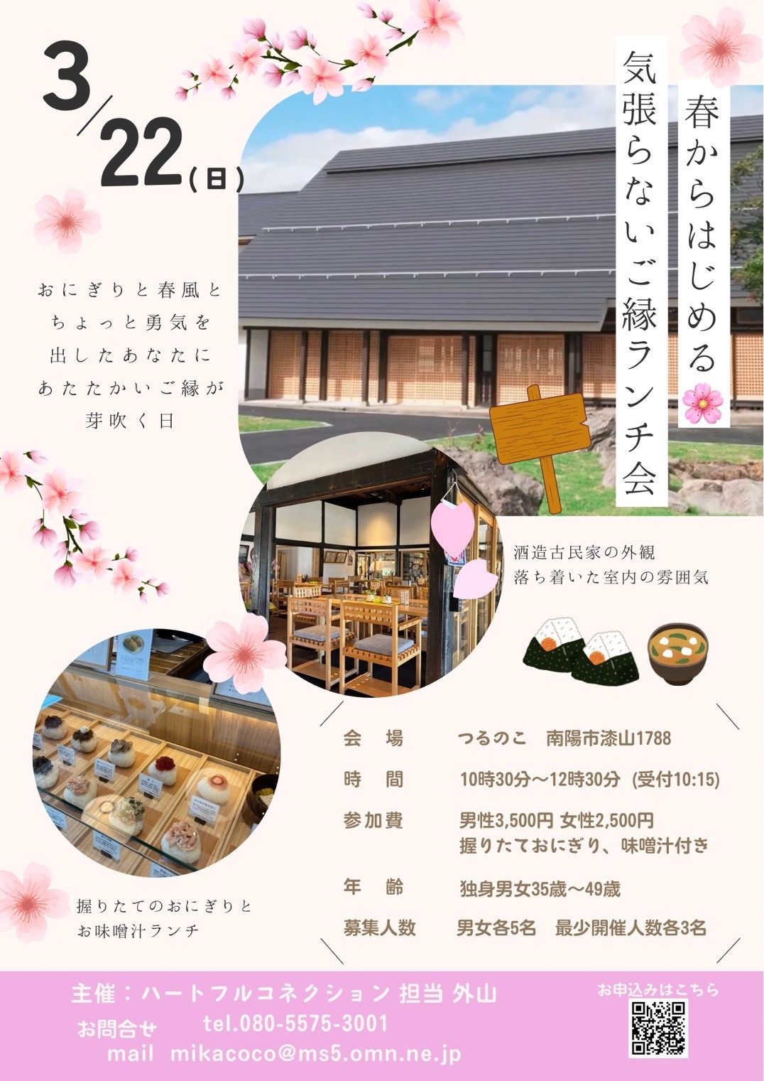 春風を感じながら新しい出会いを探してみませんか?貸切りスペースでゆったり過ごすランチタイム。人気のおにぎりとお味噌汁で気張らない交流をお楽しみください。
