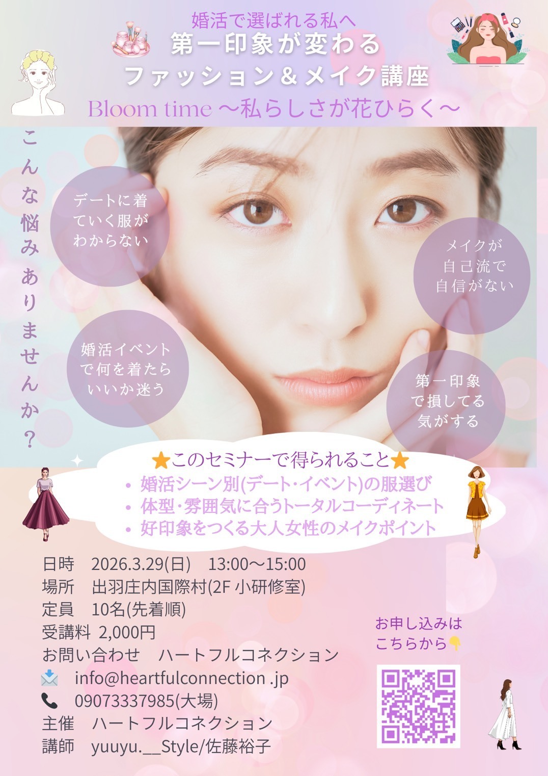 婚活に関わる不安や悩みをご相談ください。女性に人気の恋愛診断も開催しますので、お気軽にご参加ください。事前のお問い合わせや確認事項は下記宛に✉をお願いいたします。